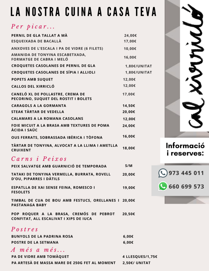 - Els plats de la carta “LA NOSTRA CUINA A CASA TEVA” i els vins de “EL CELLER” es serveixen de dimarts a dissabte (migdia) i divendres i dissabte (nit).
